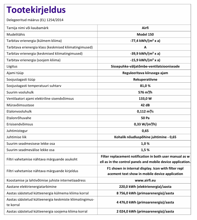 Airfi Model 150 tagab värske ja tervisliku siseõhu ka suuremates eluruumides. Seade on spetsiaalselt loodud Põhjamaade nõudlikesse kliimatingimustesse, pakkudes töökindlust ja energiatõhusust ka külmadel perioodidel.